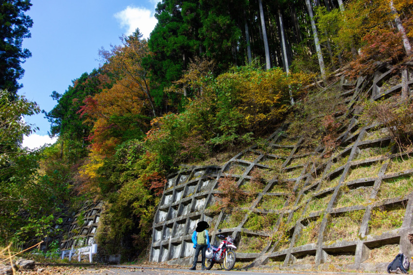 丁度秋めいてきた時期で、紅葉にセローの赤いボディが上手く溶け込み、わりと同化しているような。。