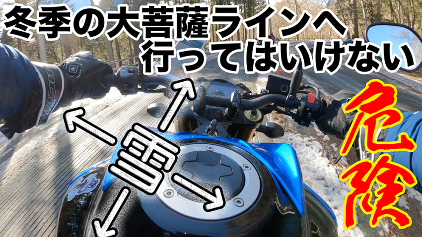 この写真の通り、融雪剤が溶けた後なのか凍結しているのかぱっと見でわからないので、ワタシと同じバカな前を走るバイク乗りの軌跡をトレースしながら走ります。