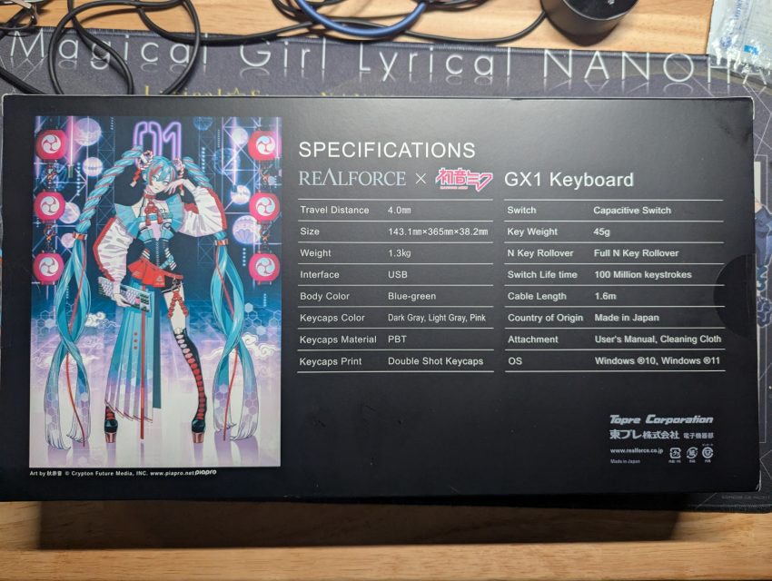 そんな中、Amazonを見えていたらタイトルにある「REALFORCE×初音ミク GX1 Keyboard X1UCM1」を見つけ、ポチりました。ええ、もちろん職場用です。