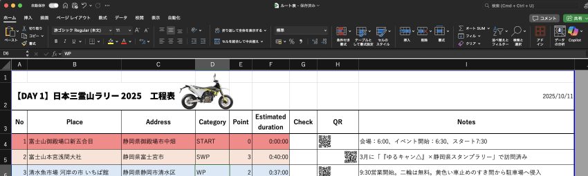 色々試行錯誤しまくったので実用的かはともかく満足できるエクセルが作れたらかなと思うんですが、特に、「立ち寄り地点」ではなく「立ち寄り地点最寄りバイク駐輪場」を一件ずつググってその場所のGoogle MapsのショートカットをQRコード化した画像を貼り付けているのが我ながらナイスアイデアだなと思います。