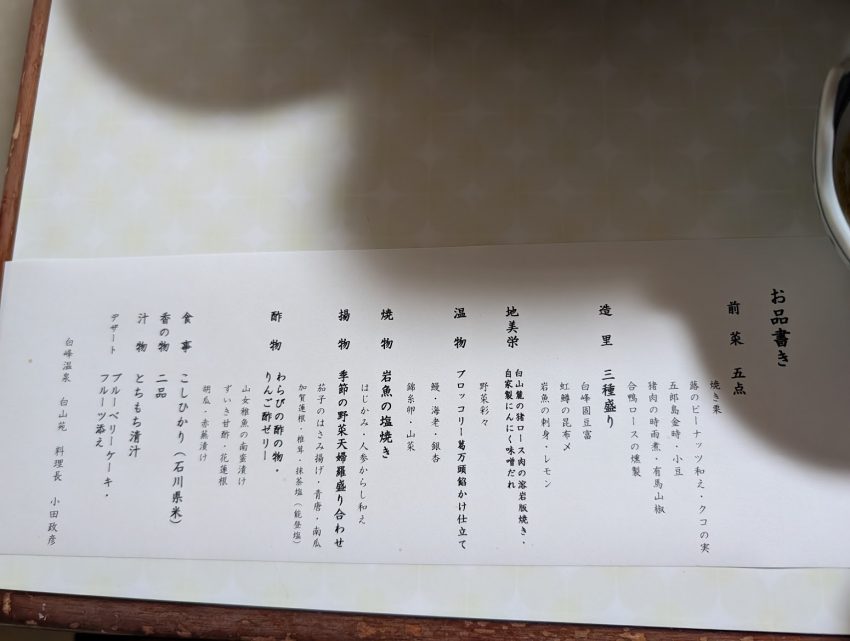 流石にこれから自宅まで戻るような体力は残ってないだろう、というのは予測済みで、石川県白峰温泉にある白山苑という宿を予約しそこで一泊しました。
