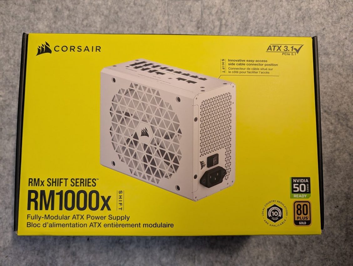 - 本当は家に眠っている電源を流用する予定でしたが、RTX4000番台から補助電源に「12VHPWR」というコネクタを採用することになりATX3.0対応電源が推奨になったことで新規で調達しました(変換コネクタを使用することで従来の6、8ピンでも対応出来るよう)。「Shift」とつくコルセアの電源は「サイドプラグイン方式」という特殊な形状をしているのでケースを選ぶ点は注意です。