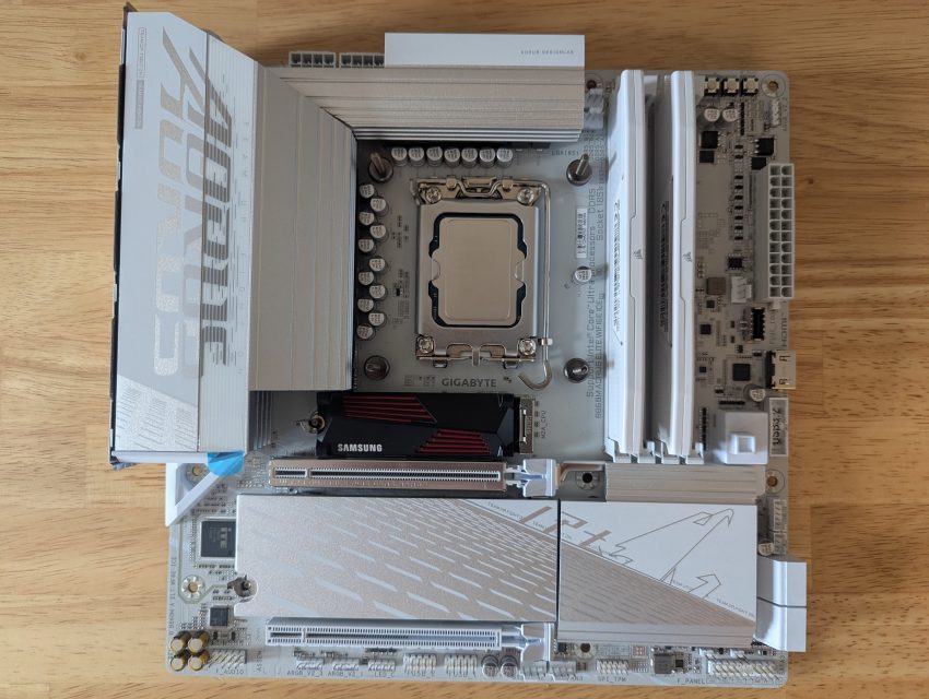 - ASRock→Asusと使ってきてまたAsusを使うのもアレだなと思いGIGABYTEをチョイス。コスパやPCケースよりMiro-ATXのホワイトモデルに。USB4 Type-CとBluetooth、2.5GbEとインターフェース周りも充実していて、OCもしないのでB860チップセットで十分と判断。