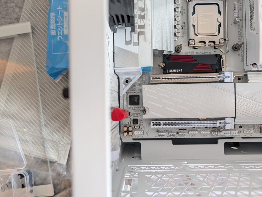 PCケースの縁がマザーボード取り付け用のネジ穴と干渉し小型ドライバーしか入りません。しかもドライバー持ち手がPCケースに干渉するのでネジ穴を回せないんですよね。Youtuberの忖度を見破れなかった私がわるいです。