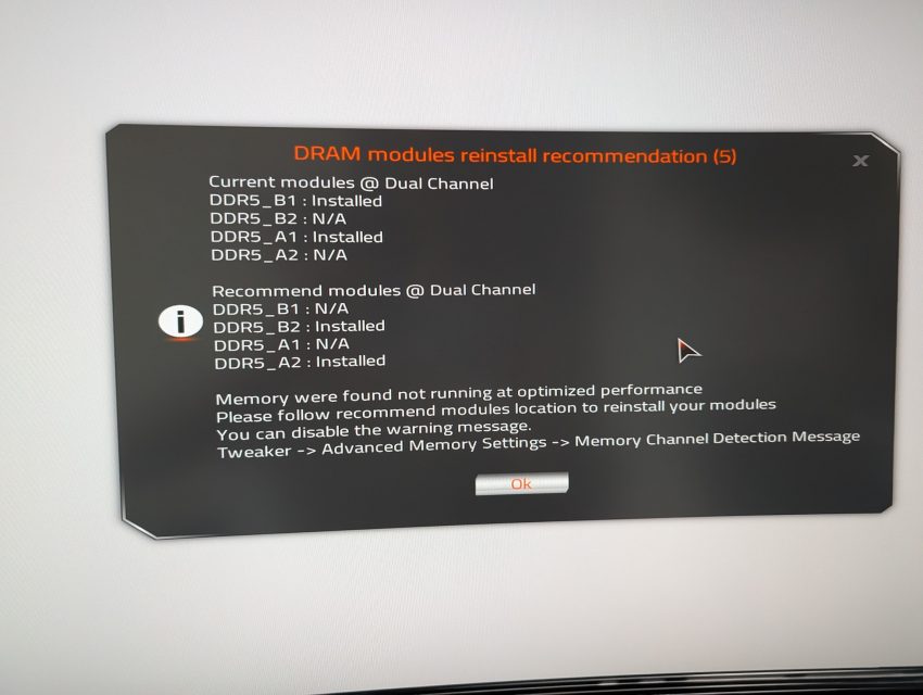 するとUEFIでメモリ取り付け位置に関する警告がでました。