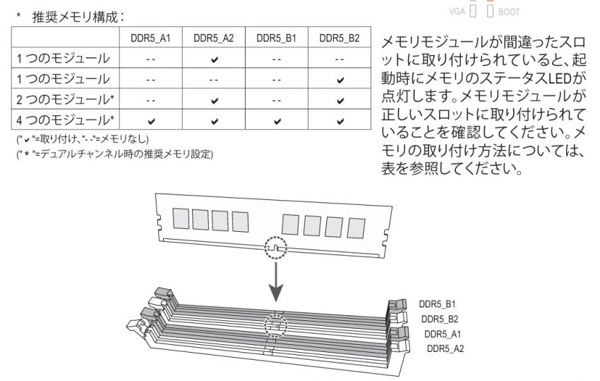 なので、1ページの記憶が15ページ目によってオーバライドされた私は取説通りの配置にメモリを挿したのですが、そもそも15ページ目の図が誤っていたことで警告が出たわけですね。