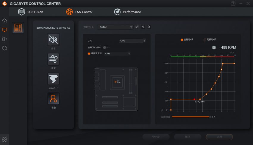 CPUクーラ(簡易水冷)のファンですが回転数が20%以下だと電圧不足なのかファンが回らなかったので21%を最低値としました。