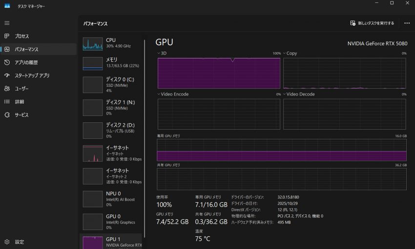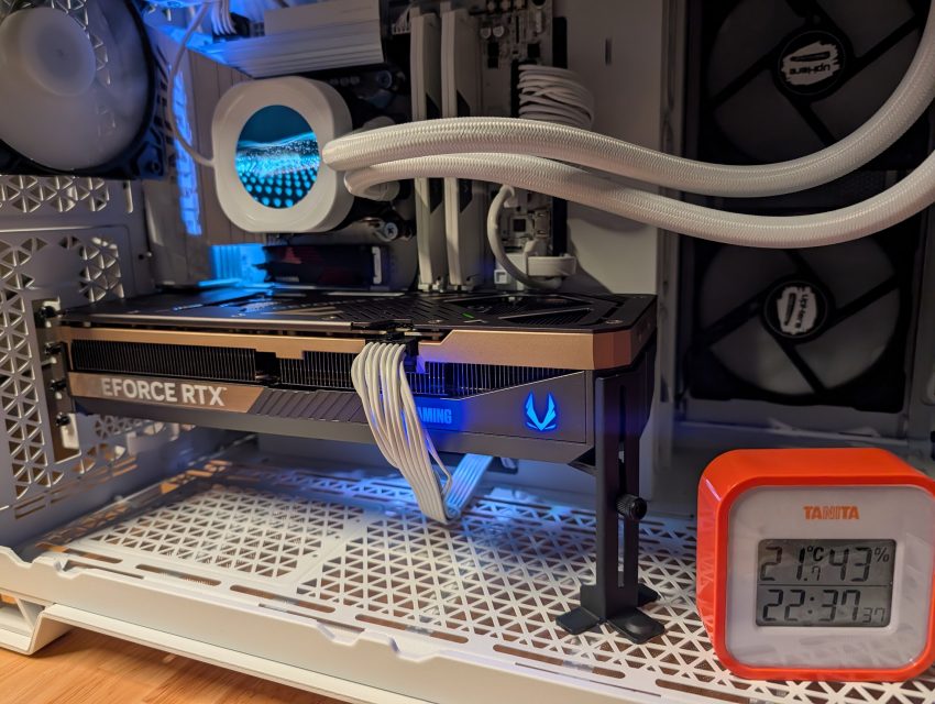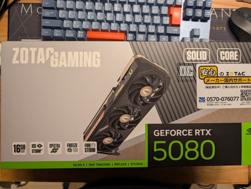 - RTX5080 Super(仮称)がGDDR 24GBで出るとか言われている中で買うタイミングを伺っていたのですが、昨今の円安を踏まえると値下げすることはないだろうということで勢いで購入。管理する上でGIGABYTEのGPUがよかったのですがあまりにも高価だったので、安価で評判の良さそうなZOTACに。ホワイトモデルにしなかったのは単純に価格面による妥協です。