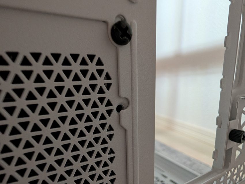 両側面と上下はメッシュになっていてフィルターもついているので通気性は良さそう。側面パネルの取外しもスライドする方式ではなく上部からコンニチハする形なので、ネジ止めしなくても固定可能で背面スペースの余裕がなくても簡単に取外しできます。これはいいですね。