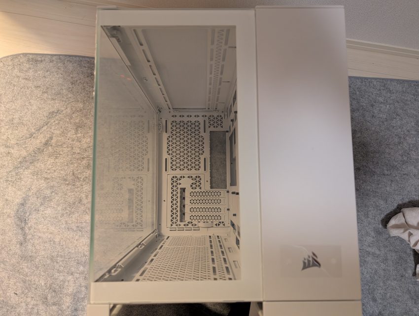 - 前回に引き続き白を基調としたPCにしたかったのと、コルセアが好きなのと、GPUの発熱問題からデカめのMicro-ATX対応ケースにしました。実物を見ないで買ったのが災いしサイズ感が予想の2倍大きく大失敗。やらかした。最悪。
