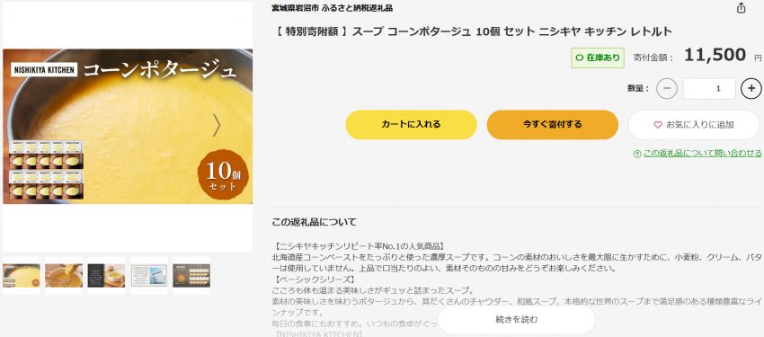 岩沼市に本社と工場があるという株式会社にしき食品の「NISHIKIYA KITCHEN」ブランドのコーンポタージュです。