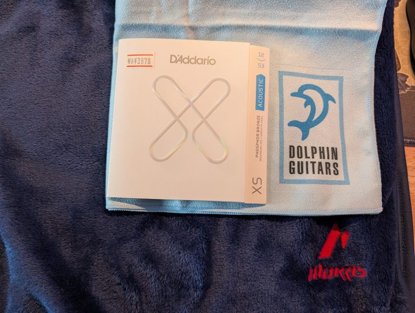Morris購入キャンペーンで配っている膝掛けと、ドルフィンギターズのロゴ付きクロスをもらったのと、コーティング弦が好きなのでダダリオの「XSAPB1253」を別途購入しました。